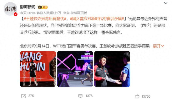 WTT澳门冠军赛男单决赛驱逐,寰宇排行第一的王楚钦以4-0的比分横扫巴西选手雨果·卡尔德拉诺,夺得冠军,四局比分为11-9、11-7、11-9、11-4,凭借这个冠军带来的1000积分,王楚钦在最新一期寰宇排行中以9425分重返男单寰宇第一宝座,以50分的狭窄上风超越此前排行第一的林诗栋,但是王楚钦夺冠,官方媒体却泼上了一盆冷水,《澎湃新闻》以《王楚钦夺冠背后有隐忧,国乒需要应酬新期间的“赛训矛盾”》为题目,发表了一篇著述,除了点名林诗栋智商有待教诲之外,还宣称国乒男单在近几站“独苗”成常态,值得警惕!我们来扫视望望文中所述