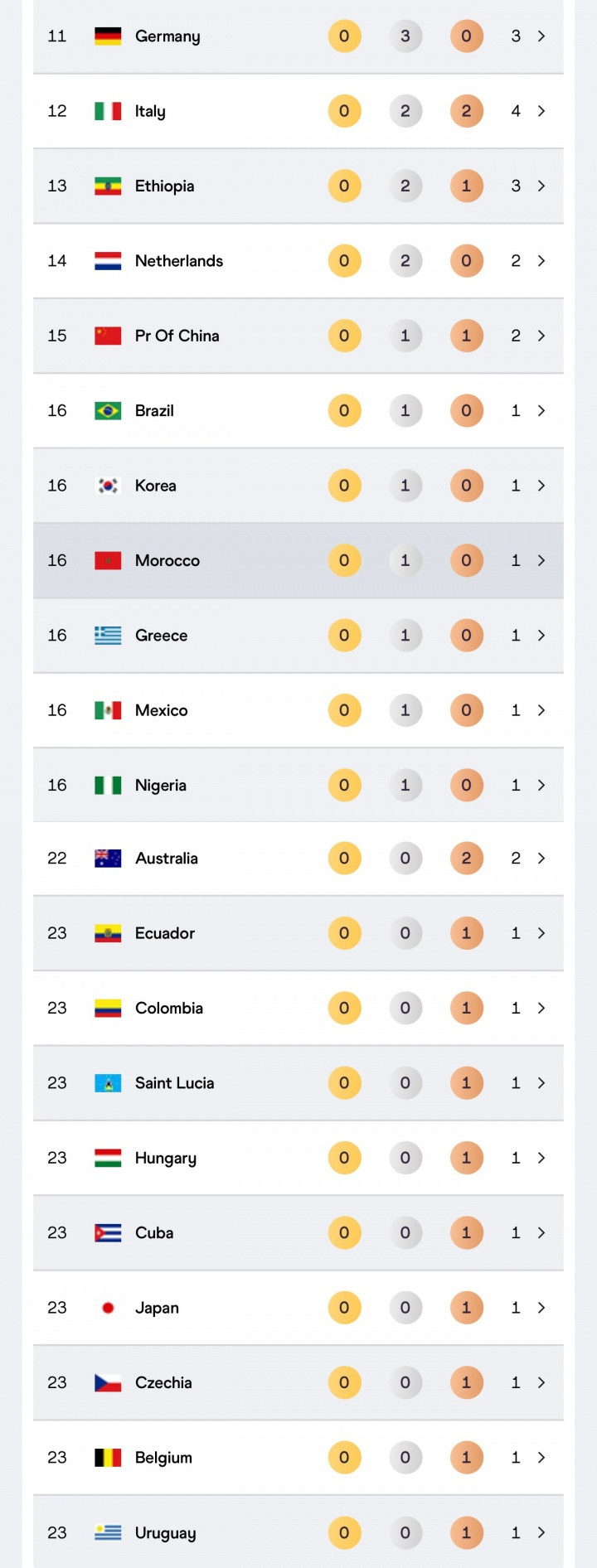 13、埃塞俄比亚,0金2银1铜,3块奖牌