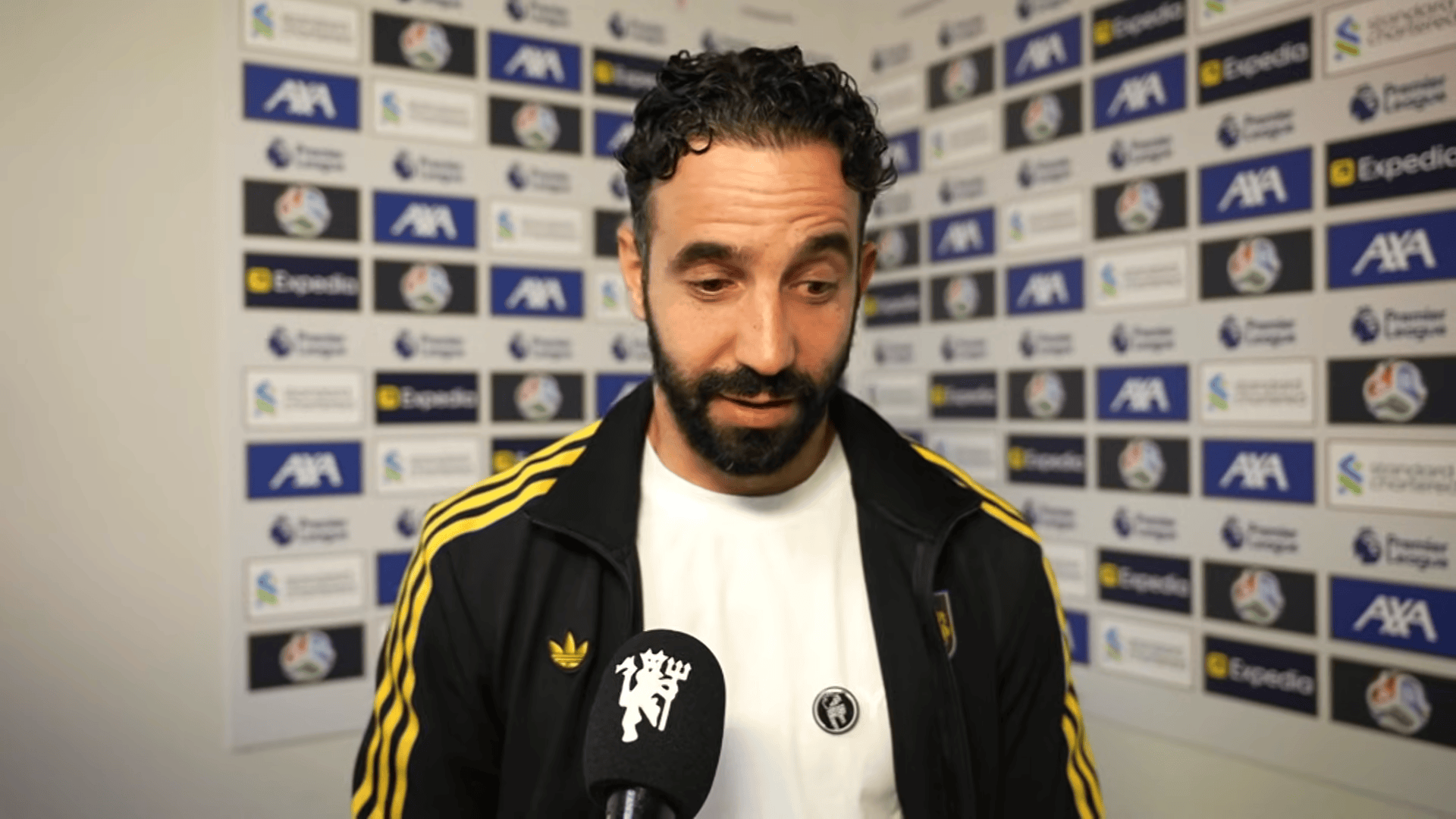 虎扑10月20日讯 英超联赛, 利物浦1-2曼联。赛后体育录像/图片,曼联主帅阿莫林摄取俱乐部官方电视台采访。