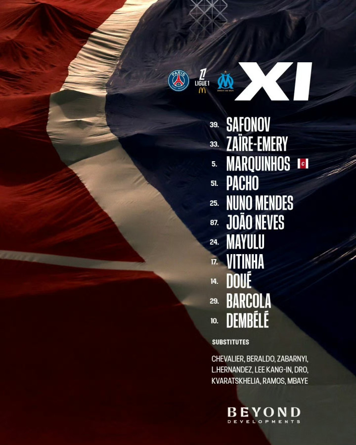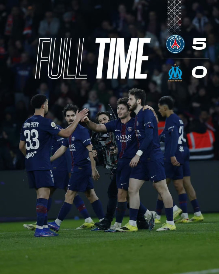北京时间2月9日03:45,法甲联赛第21轮焦点战法兰西国度德比,巴黎圣日耳曼主场对阵马赛。上半场登贝莱梅开二度,巴尔科拉中柱,下半场梅迪纳乌龙,克瓦拉茨赫利亚、李刚仁各入一球。最终巴黎圣日耳曼以5-0投诚马赛。