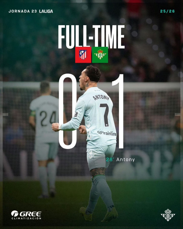 北京时间2月9日01:30,西甲联赛第23轮,马德里竞技主场对阵皇家贝蒂斯。上半场安东尼内切远射破门,补时阶段卢克曼头球破门,但越位进球无效。下半场格列兹曼造迭戈-略伦特乌龙,但裁判走漏此前越位,进球无效。最终马竞两球被吹0-1不敌贝蒂斯。
