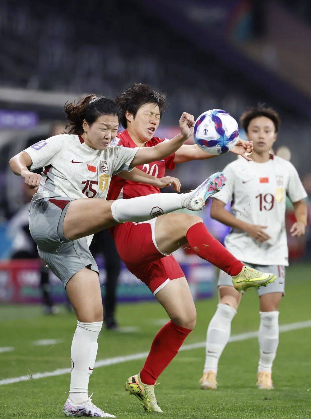 中国队球员王爱芳(左)和朝鲜队球员蔡恩英(中)在比赛中拼抢